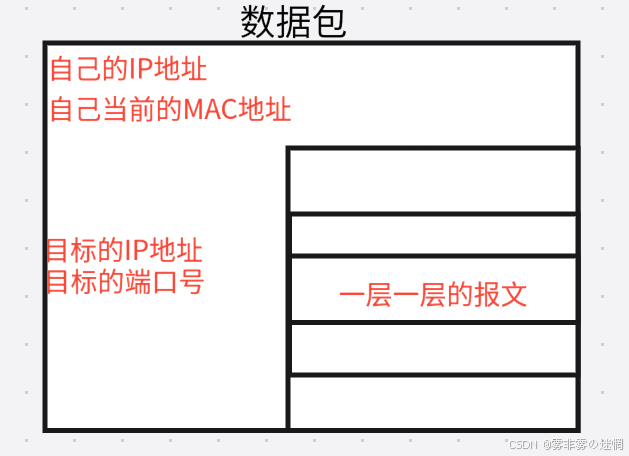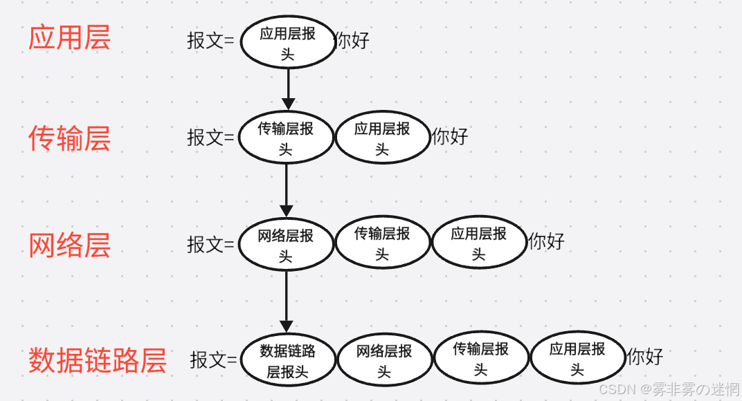学习通信过程之前,我们需要先知道报文:报文=报头(每层的识别标志)+有效载荷(数据内容)