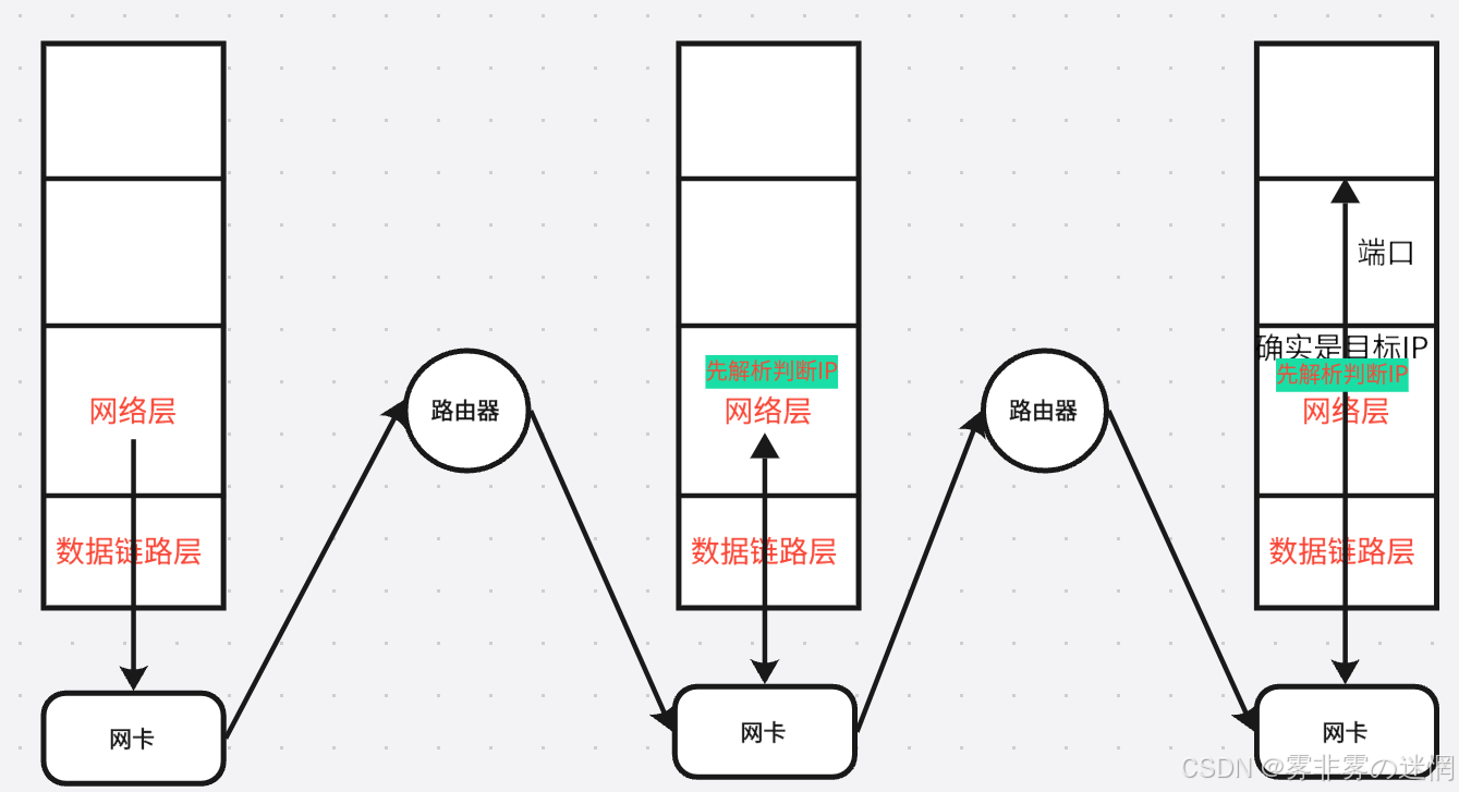 (1)此时数据包进入局域网,局域网看到数据包需要远距离通信后,再交给自己的路由器(2)此时路由器传给途中的其它设备,通过解析拿到IP地址(被每个路由器解析到网络层)
