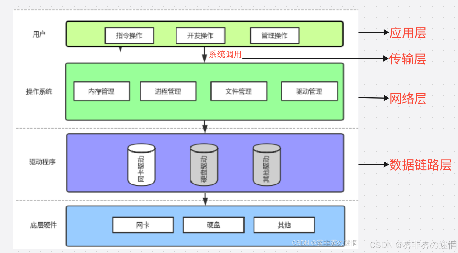 - 应用层:直接对接用户进程(如浏览器、QQ),负责处理具体业务逻辑。