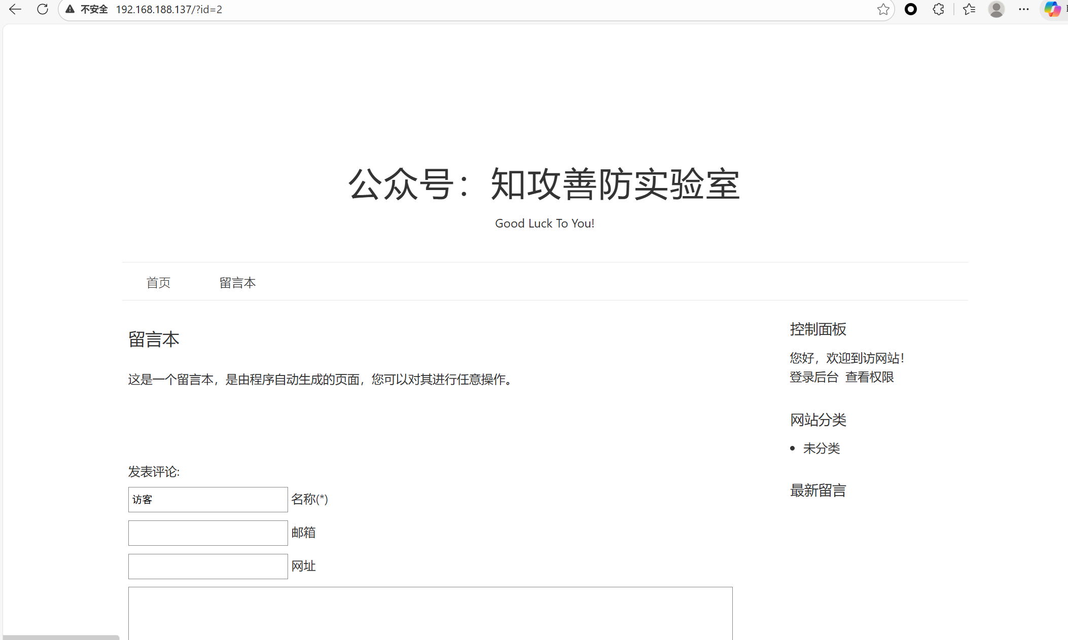 不行,我不太了解这个网站所以我还是开启了靶机,然后真实配合渗透来玩的 点击留言本之后有一个id=2,然后我加了一个单引号,进入了,出现了报错页面,同时有一个登录按钮