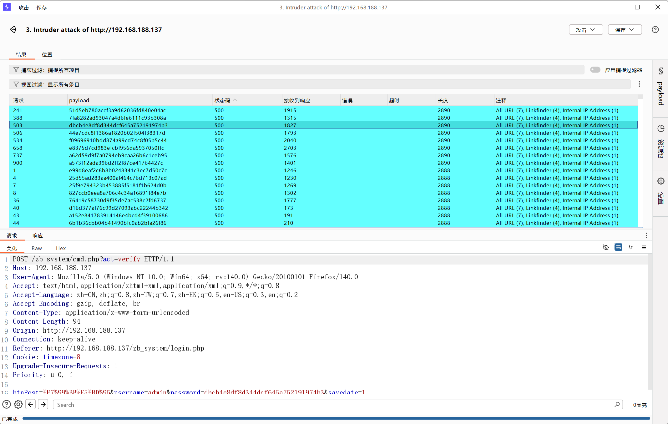 说明攻击者应该是通过bp或者某工具来进行爆破账号密码的,最终成功了,成功的状态码应该是302,之前的截图中也有看到,这样子就去筛选访问郭cmd.php的ip地址就好了