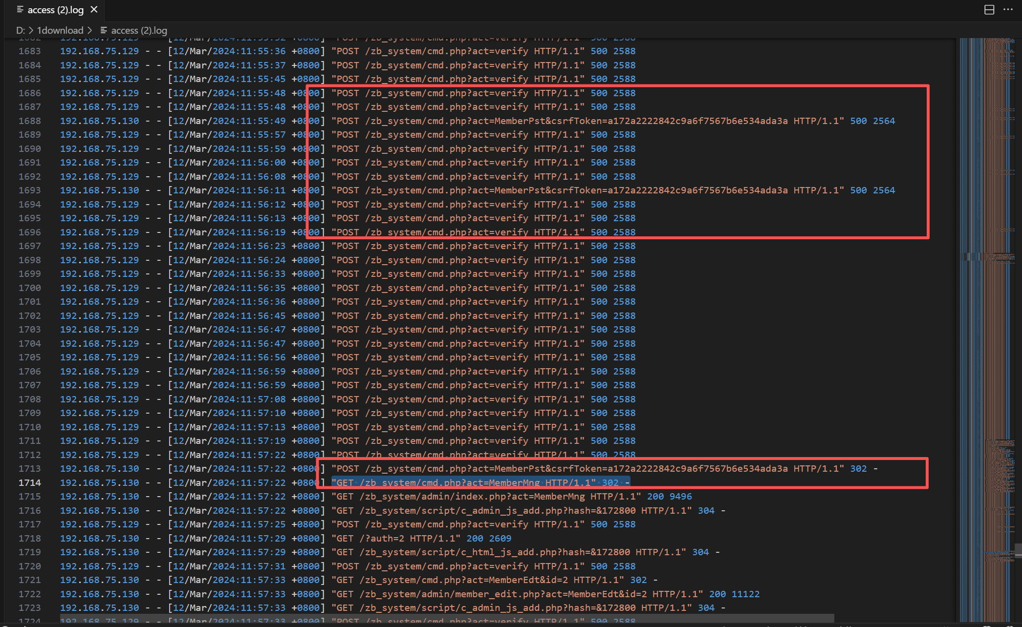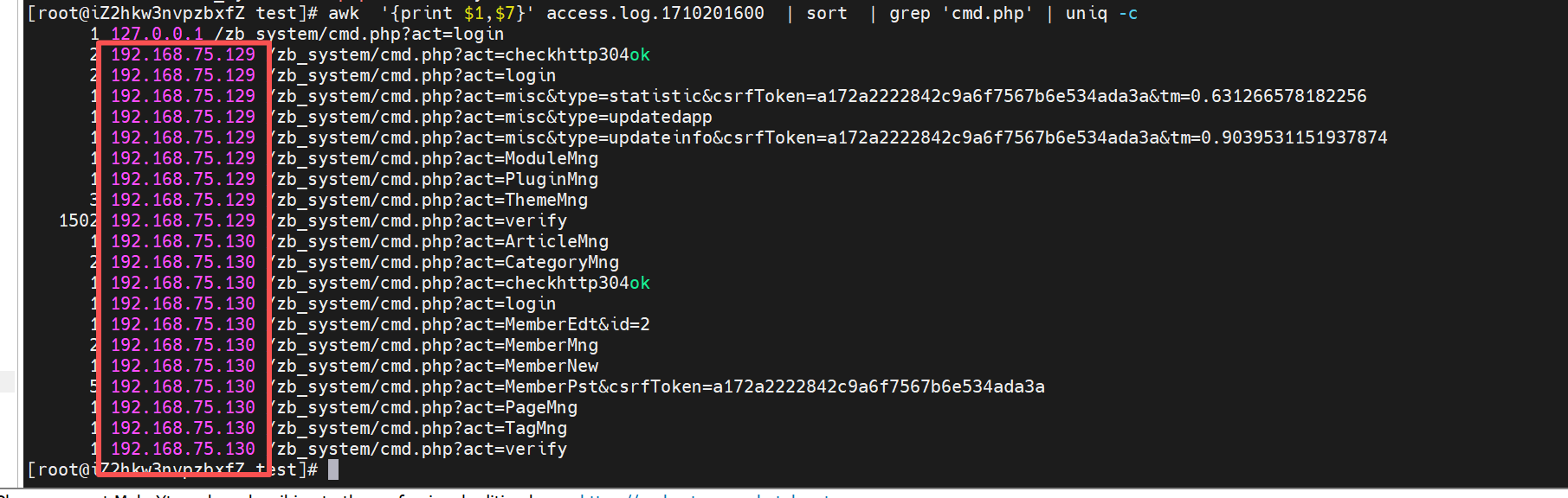 [root@iZ2hkw3nvpzbxfZ test]# cat access.log.1710201600 | grep 'cmd.php'