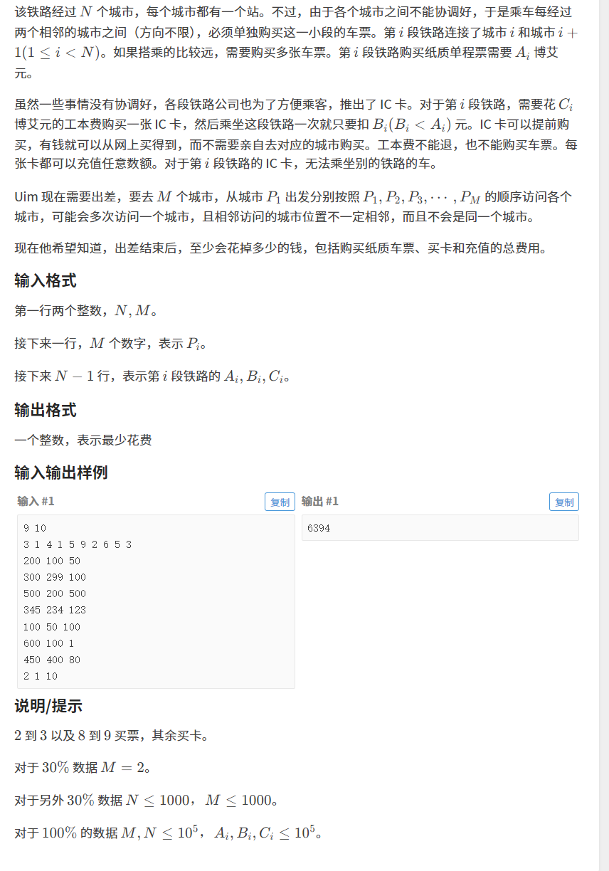 1.先考虑如何让花费最小,想要求最小花费,需要知道每⼀段高铁被「乘坐了多少次」,记作f[i],那么最小花费就是「买票的花费」与「买卡的花费」两者之间的最小值:f[i]