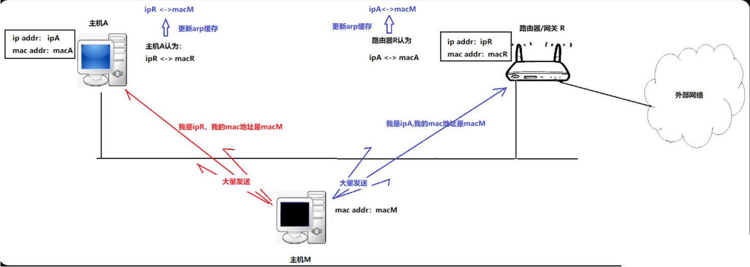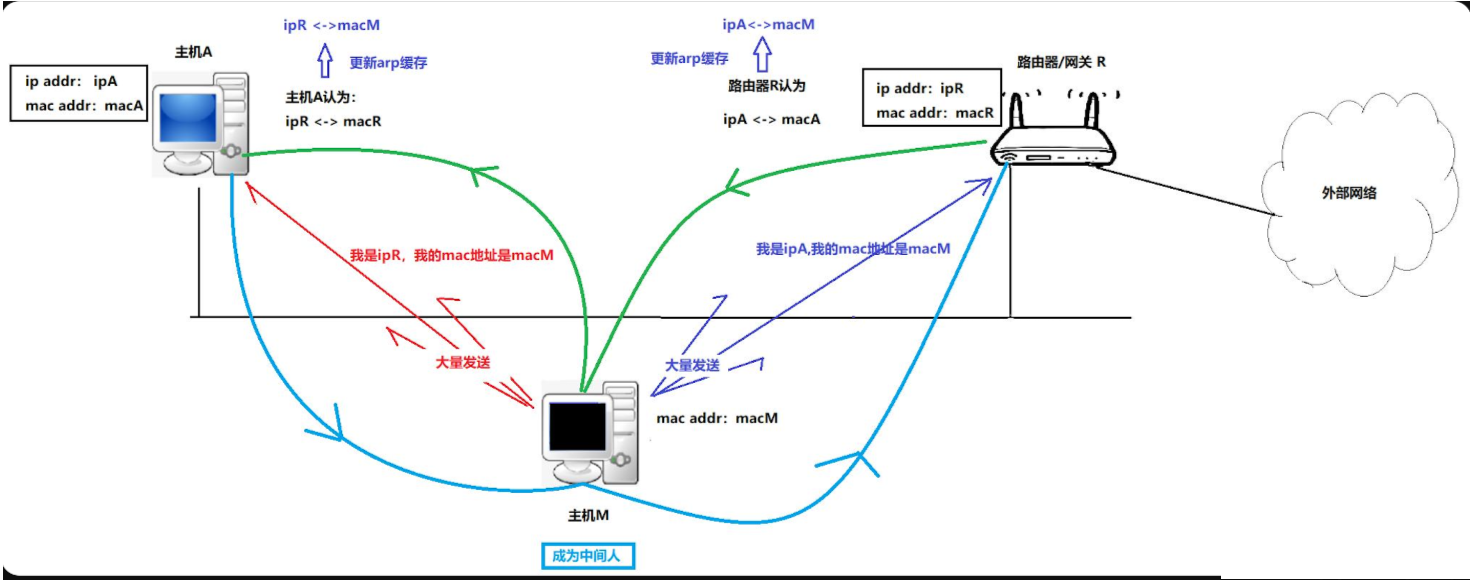 但是,如果这时候有一个"坏蛋"(攻击者M)想捣乱,它会伪造一个ARP响应,假装自己是主机 R,把自己的 MAC 地址发给你。你的电脑收到这个伪造的响应后,就会把攻击者的 MAC 地址当作主机 R 的 MAC 地址,记到自己的 ARP 缓存里。