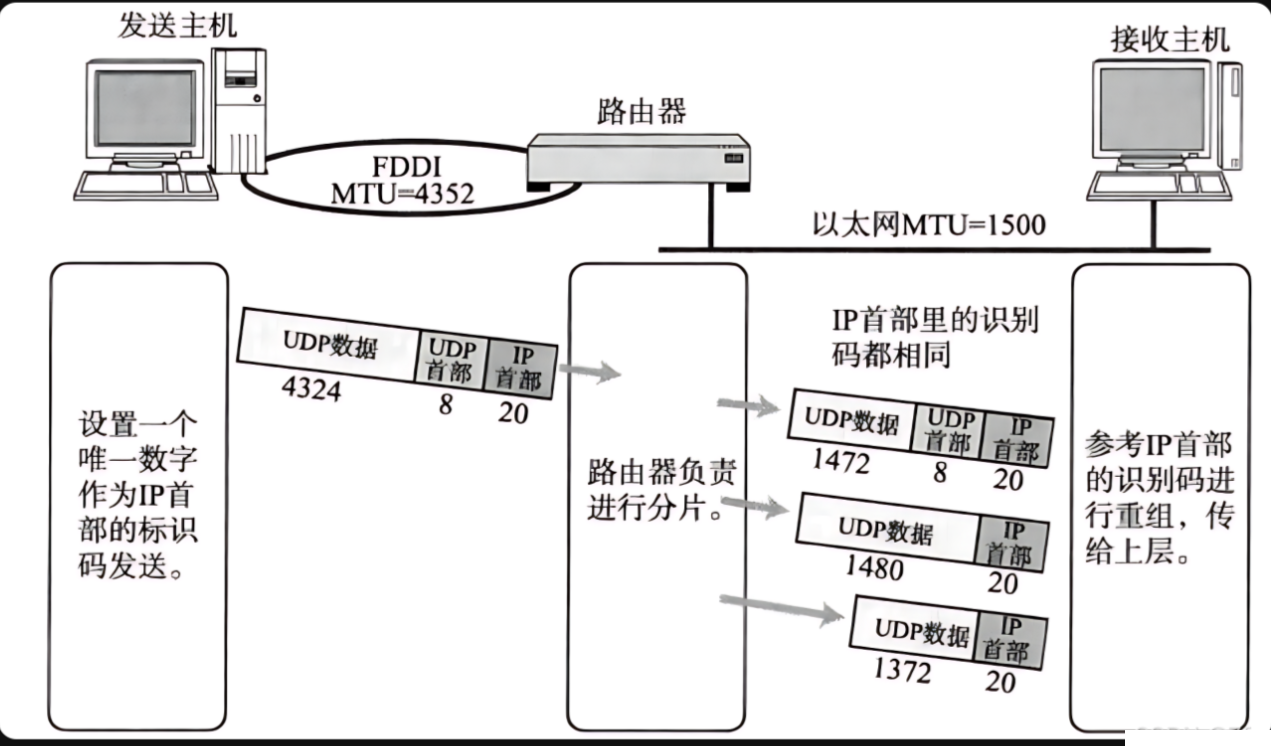 - 如果一个数据包从以太网路由到拨号链路上,数据包长度大于拨号链路的 MTU 了, 则需要对数据包进行 分片 (fragmentation);
