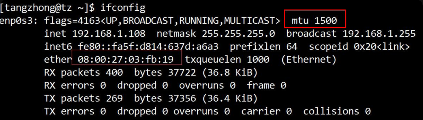 使用 ifconfig 命令, 即可查看 ip 地址, mac 地址, 和 MTU;