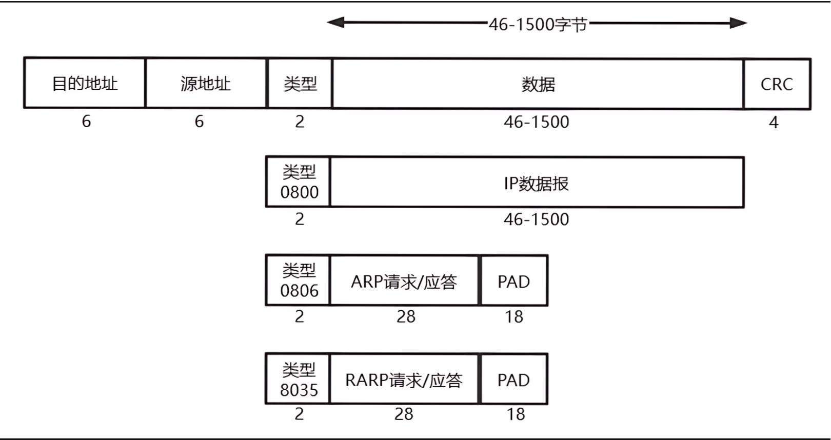 - 2 字节帧协议类型 字段有三种值, 分别对应 IP、 ARP、 RARP ;