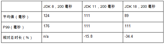 JDK 8 的暂停平均时长为 124 毫秒,P99 为 176 毫秒。JDK 11 将平均时长提高到了 111 毫秒,P99 提高到了 134 毫秒,总体减少了 15.8% 的暂停时长。JDK 18 再次显著改善,平均时长减少到了 89 毫秒,P99 减小到了 104 毫秒,总时长减小了 34.4%。