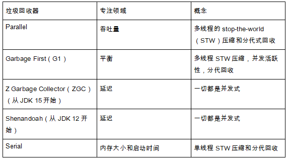 OpenJDK 提供了五种 GC,分别专注于不同的性能度量。表 1 列出了 GC 的名称、专注领域,以及实现特定特性所使用的核心概念。