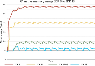 图 4 展示了从 JDK 8 到 JDK 18 中,G1 的原生内存占用情况,测试应用程序实现了一个对象缓存:对象表示缓存信息,对象可以被查询、添加,并以最近最少使用(LRU)的方式从一个更大的堆中删除。本例中的Java堆为20GB,使用了JVM的原生内存跟踪(NMT)机制来确定内存使用情况。