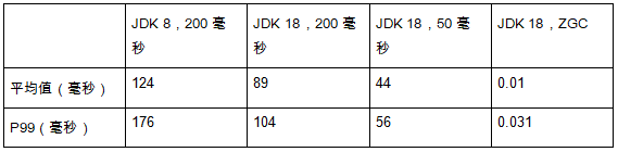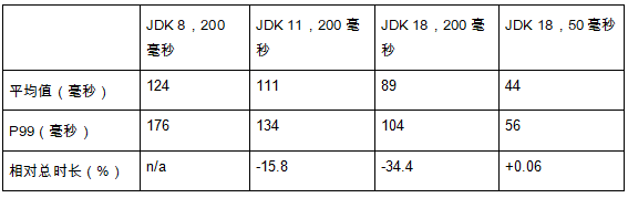 我扩展了试验范围,增加了JDK 18 下暂停时长设置为 50 毫秒,因为之前随意设置的 -XX:MaxGCPauseMillis 为 200 毫秒还是太长了。平均来看,G1 达到了暂停时长的目标,P99 垃圾回收暂停时长为 56 毫秒(见表 3)。总体上,与 JDK 8 相比,暂停花费的总时间并没有增加太多(0.06%)。