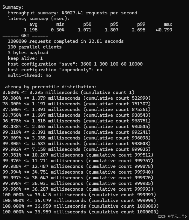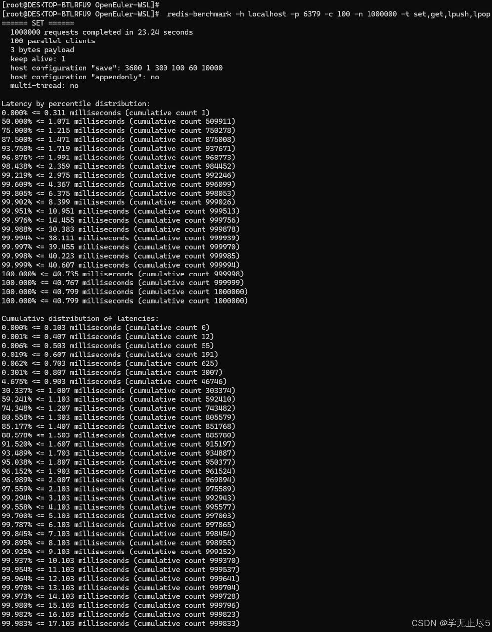 redis-benchmark -h localhost -p 6379 -c 100 -n 1000000 -t set,get,lpush,lpop