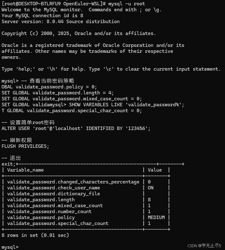 在MySQL命令行中执行以下SQL来禁用密码策略: