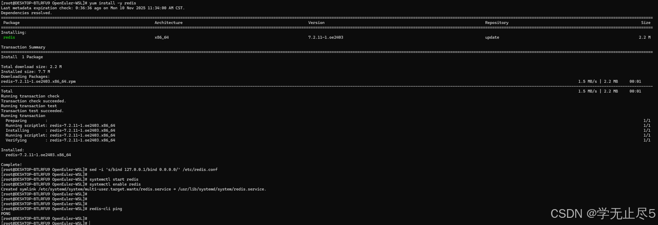 openEuler官方源已适配Redis,采用yum安装实现快速部署: