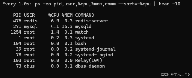 watch -n 1 'ps -eo pid,user,%cpu,%mem,comm --sort=-%cpu | head -10'
