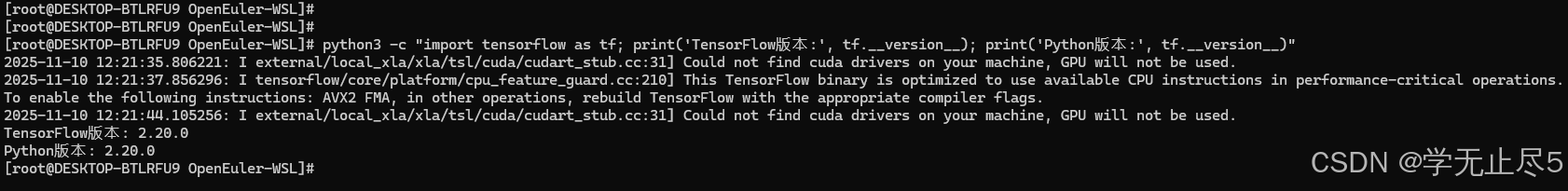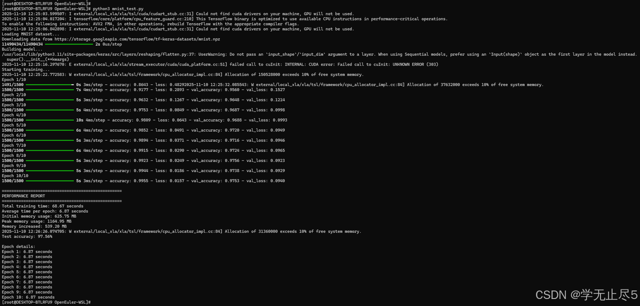 在openEuler WSL环境中,我们使用CPU进行TensorFlow性能测试,选取经典的MNIST手写数字识别模型作为测试案例。