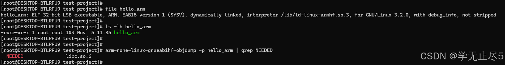 # 输出:-rwxr-xr-x 1 root root 13K Nov 5 11:30 hello_arm