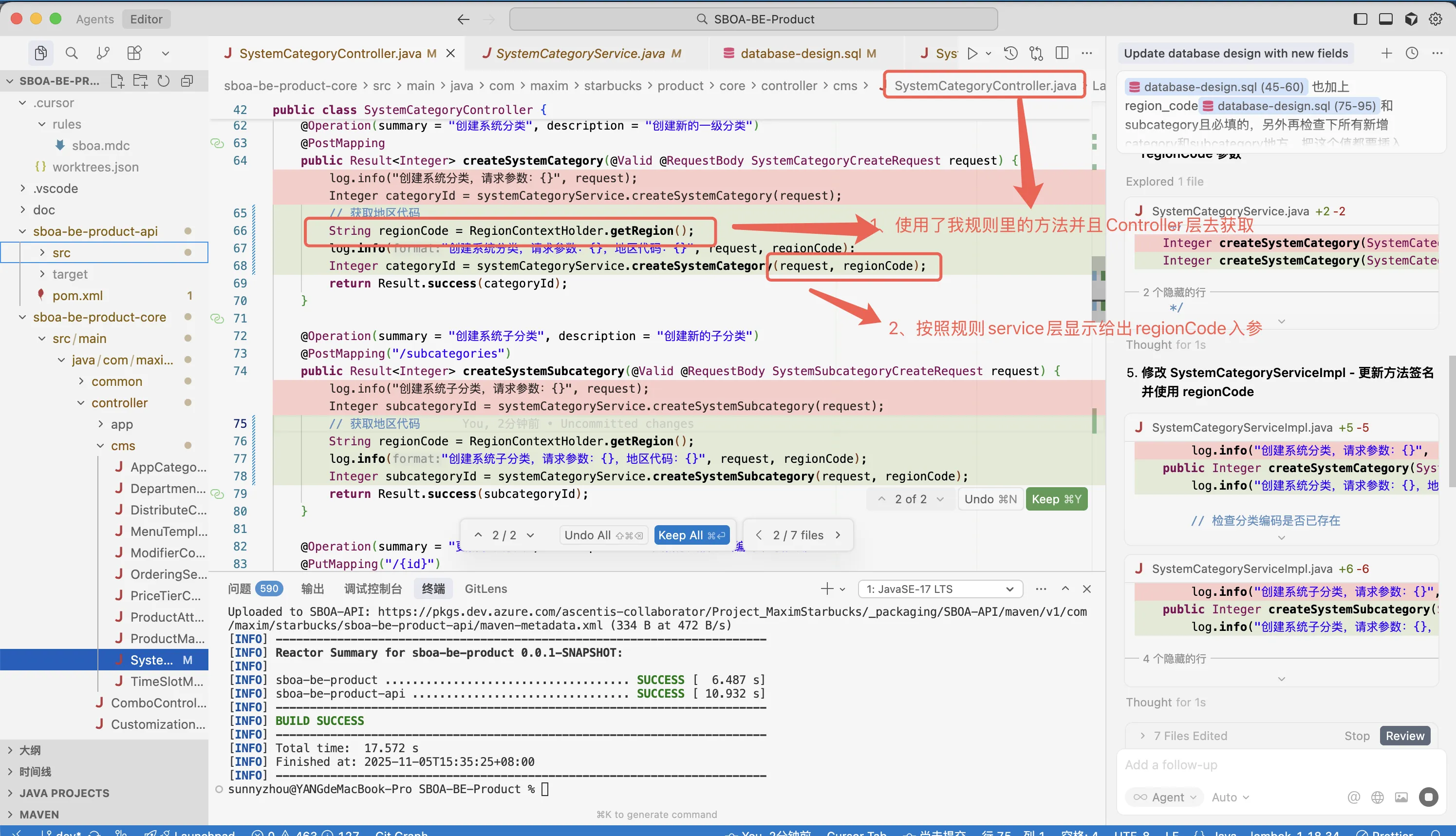 效果: 现在,当我们让 Cursor 为某个控制器生成代码时,AI 会谨慎遵循规则。