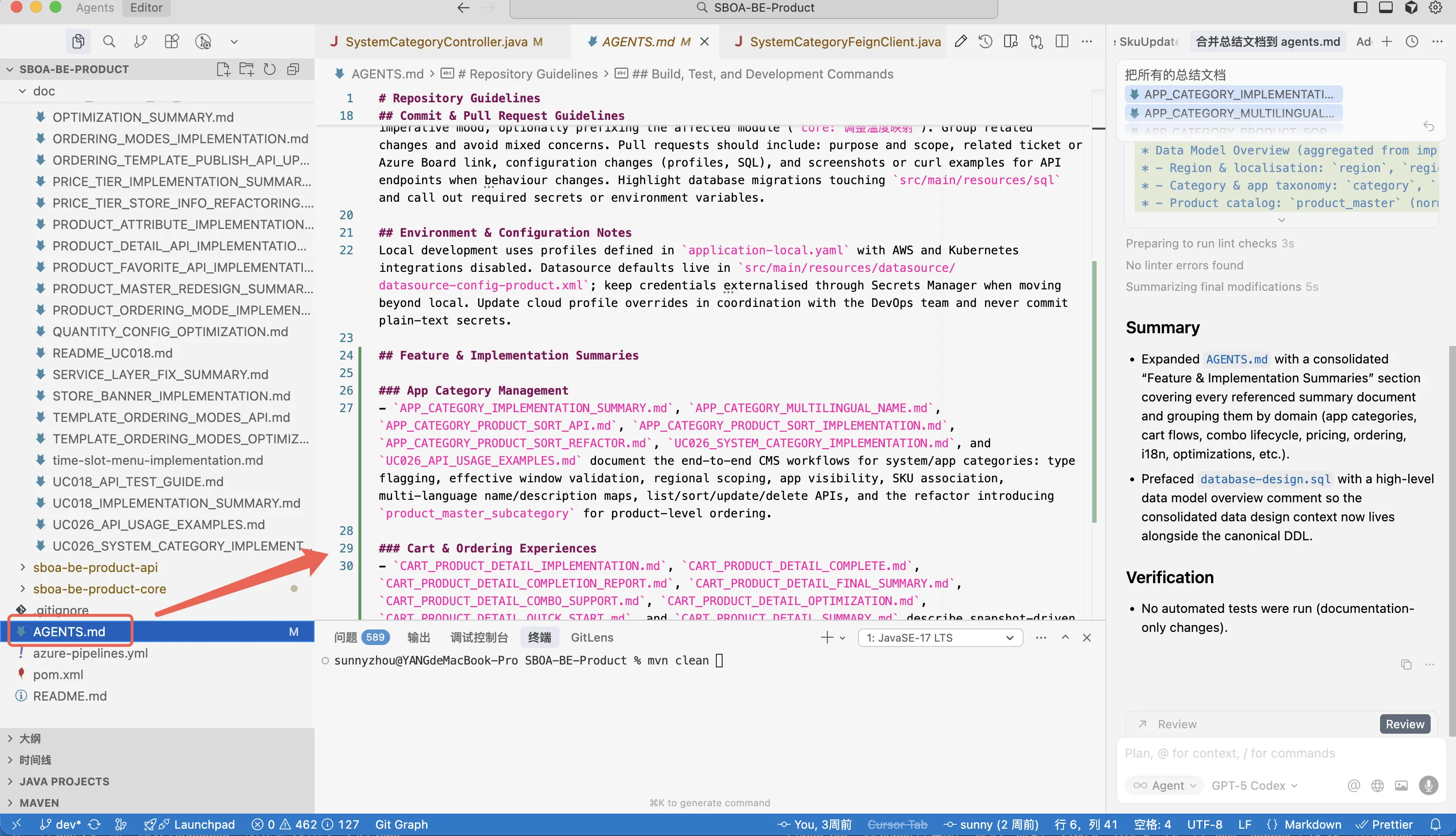 对于一般后端项目,如果不想一开始就引入复杂的 Memory Bank,强烈推荐使用一个简洁的方案:****创建 AGENTS.md 文件。使用过 CodeX (openAI 推出的 Code CLI 工具,和它等效产品有:Claude Code、阿里的 Qwen Code、腾讯的 Code Buddy Code)工具的伙伴们应该比较熟悉,它的第一条快捷命令就是 /init,会在当前目录生成一个 AGENTS.md 记录整个文档的结构!
