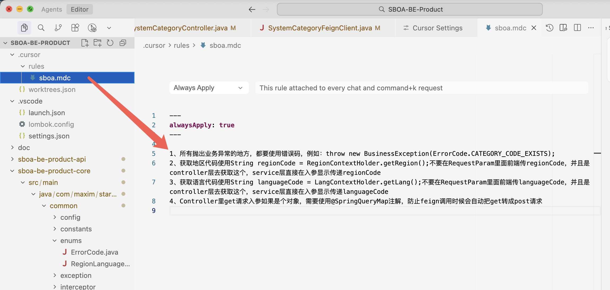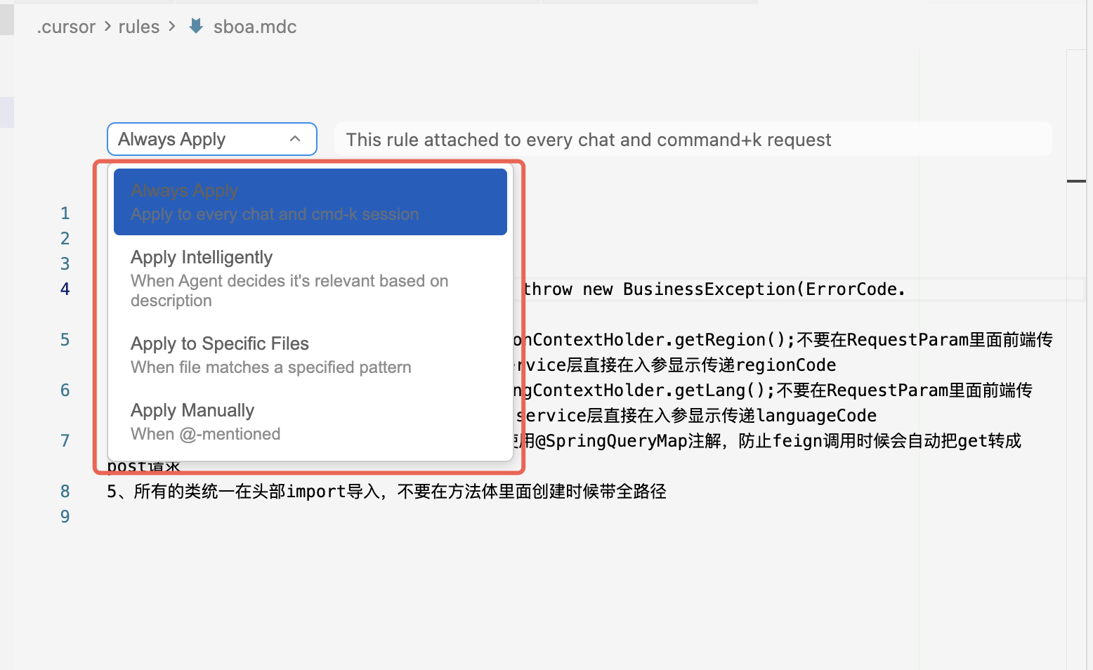 在这个.mdc 文件里你可以把自己的规则写到此处!例如:我这里代码多语言是从 ThreadLocal 去获取的,接口不要使用@RequestParam让前端传过来,这样 AI 在进行开发时候会优先读取这个规则,然后按规则去编写代码!