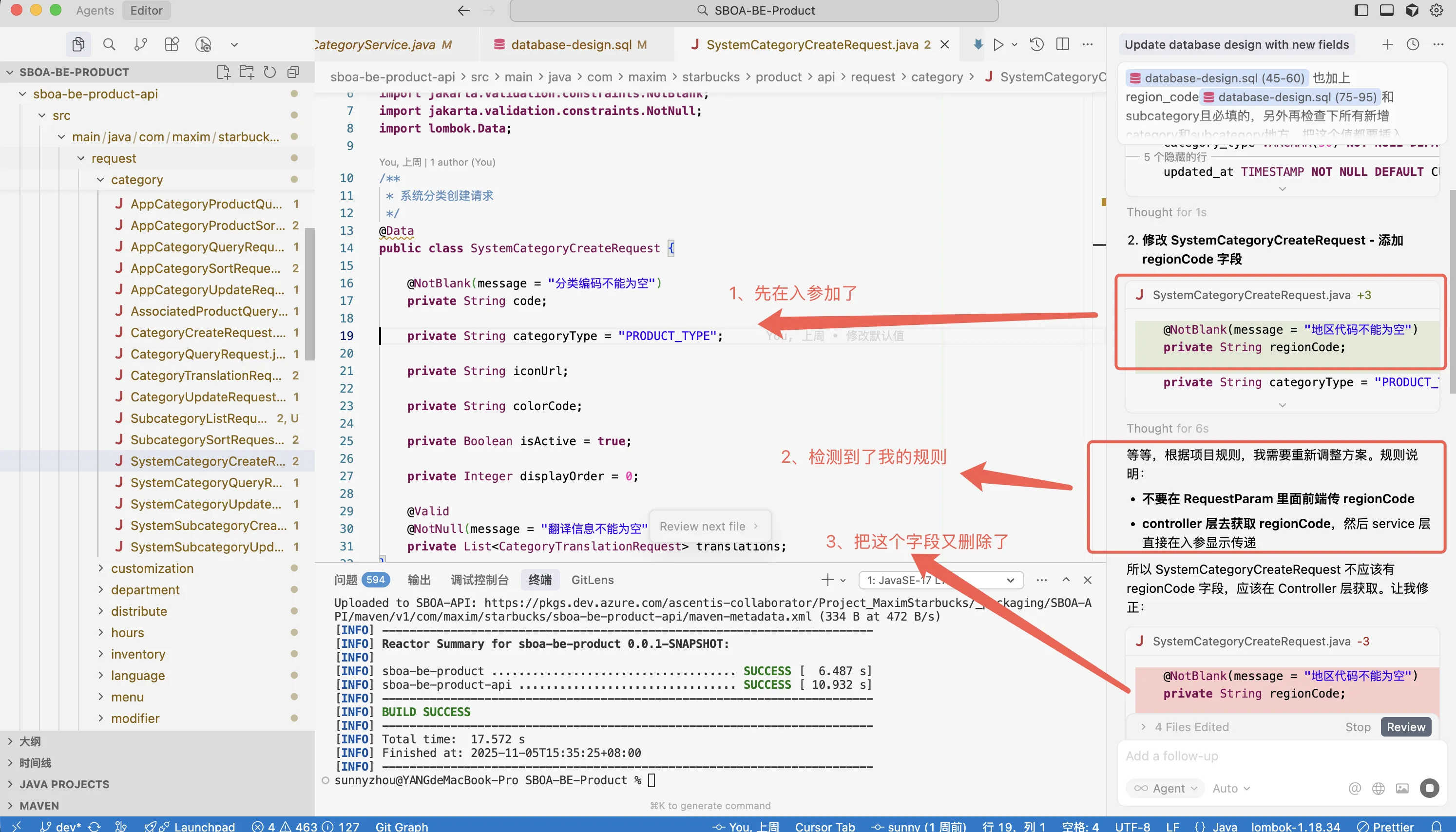 在上述 .mdc 文件中,我们用清单形式明确规定了两个要点:避免使用@RequestParam ,以及**采用ThreadLocal获取语言**。保存该规则后,Cursor AI 会在生成代码时将这些要求作为系统提示的一部分 。也就是说,当AI为我们的Spring项目编写控制器代码时,会**自动遵循这些规则**,而无需我们每次手工提醒。
