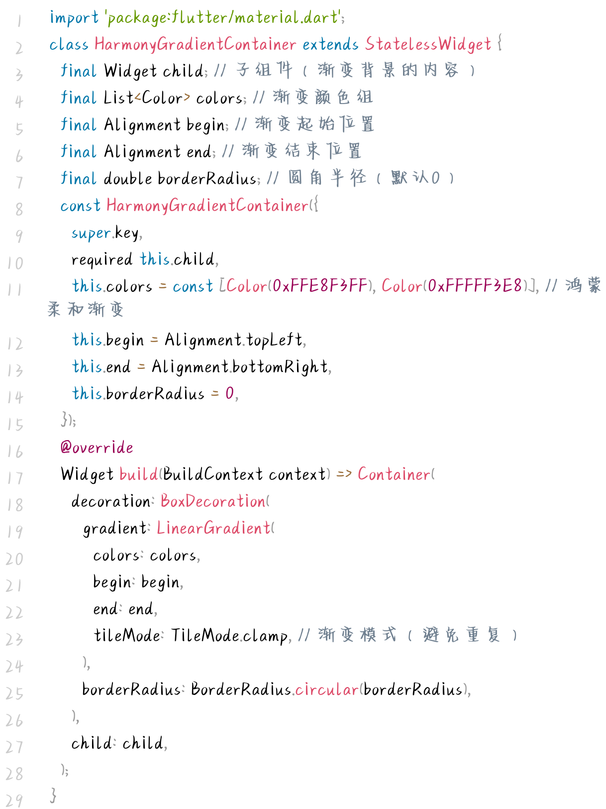在开源鸿蒙生态的页面头部、重点区域高亮、卡片装饰等场景中,渐变背景是提升视觉效果的常用手段。传统实现方式需重复编写 BoxDecoration 与 LinearGradient 代码,且渐变方向、颜色组合难以统一。因此,HarmonyGradientContainer的核心设计目标是:简化渐变背景编写、提供鸿蒙风格默认配色、支持灵活自定义,同时保持轻量无依赖。