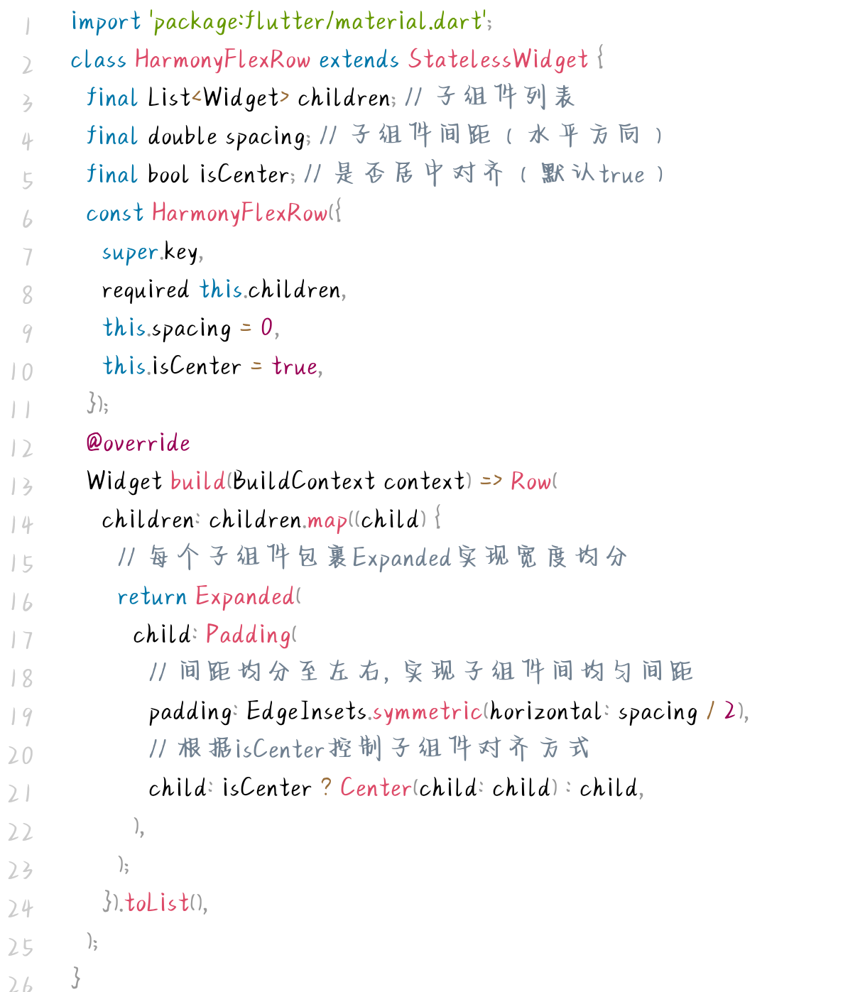 - 通过 padding: EdgeInsets.symmetric(horizontal: spacing / 2) 实现均匀间距:每个子组件左右各分配 spacing/2 的间距,相邻子组件的间距自然叠加为 spacing ,避免传统布局中"第一个子组件无左间距、最后一个无右间距"的问题;