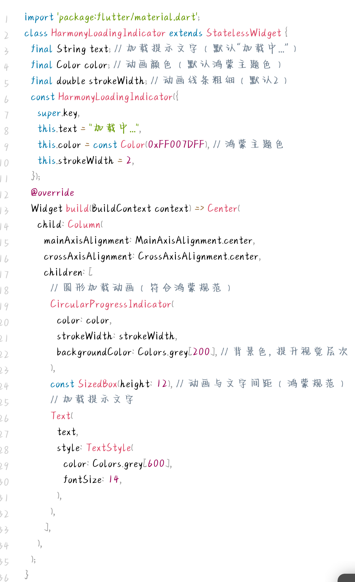 - 颜色规范:默认使用鸿蒙主题色( #007DFF ),与系统原生加载动画颜色一致,视觉统一;