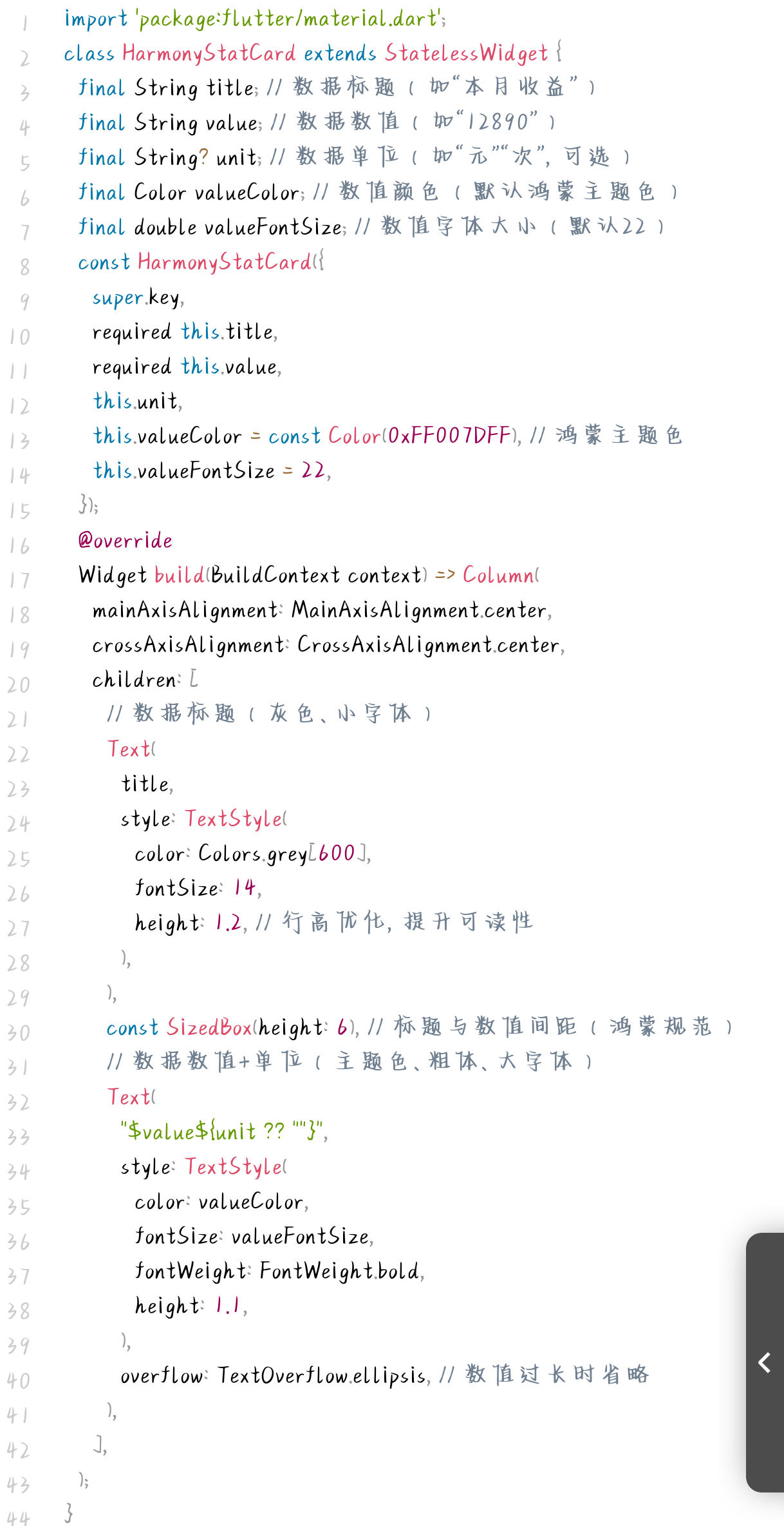 - 极简调用:核心参数最小化(如HarmonyStatCard仅需title和value),无需复杂配置,新手也能快速上手;