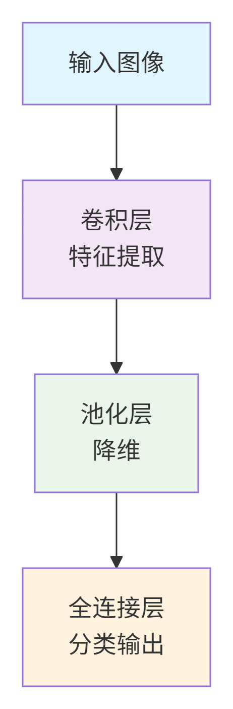 这种经典的"卷积-池化-全连接"结构是CNN的基础范式,ResNet等现代网络在此基础上增加了残差连接、批量归一化等模块来优化深层网络训练。