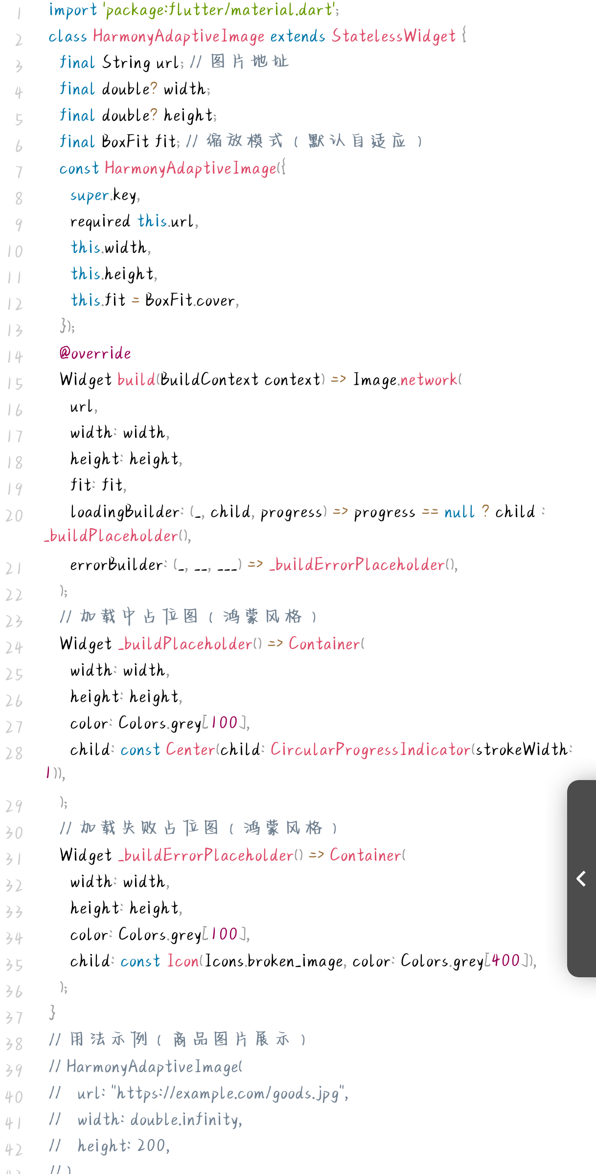 - 缩放模式:默认 BoxFit.cover ,保证图片填充容器且不拉伸,适配不同尺寸容器;
