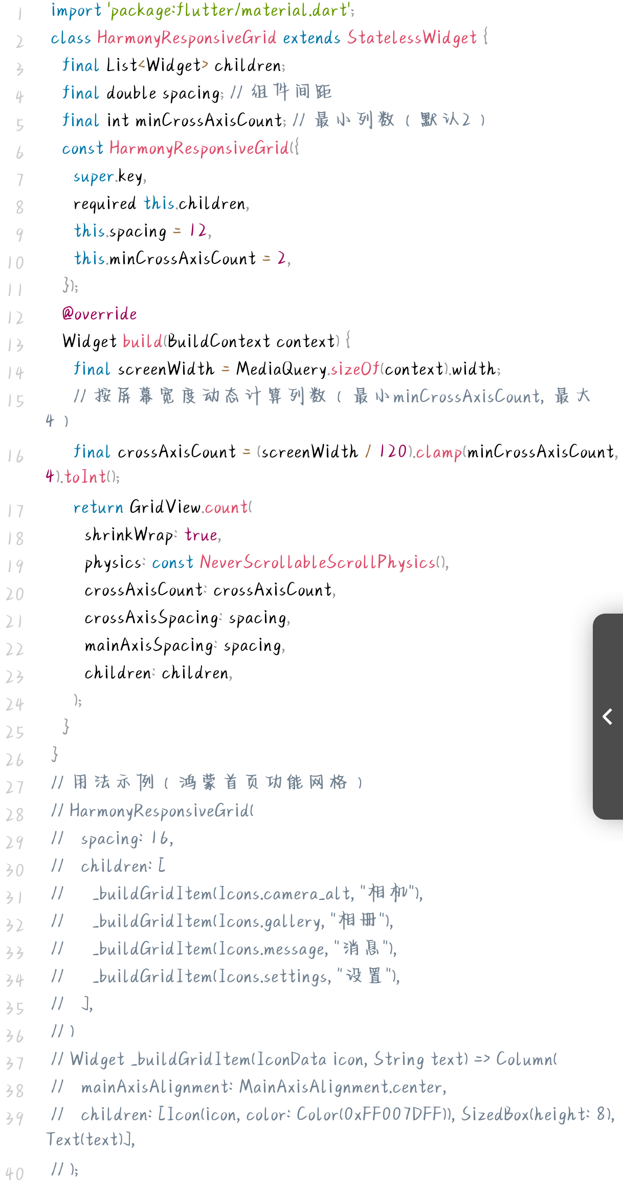 - 支持最小列数自定义:通过 minCrossAxisCount 参数适配特殊场景(如智能手表端最小列数设为1);
