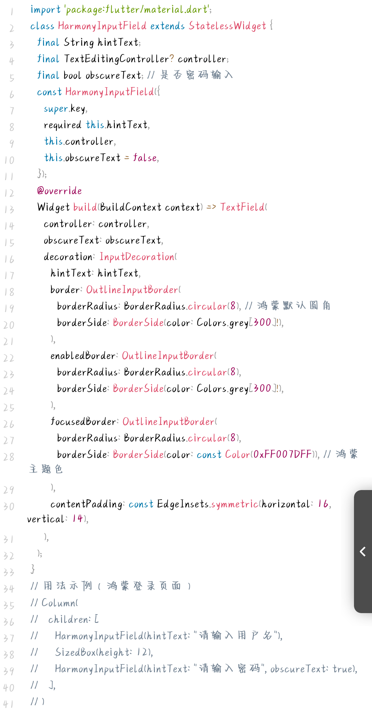 - 圆角设计: borderRadius=8 ,符合鸿蒙系统输入框圆角规范;