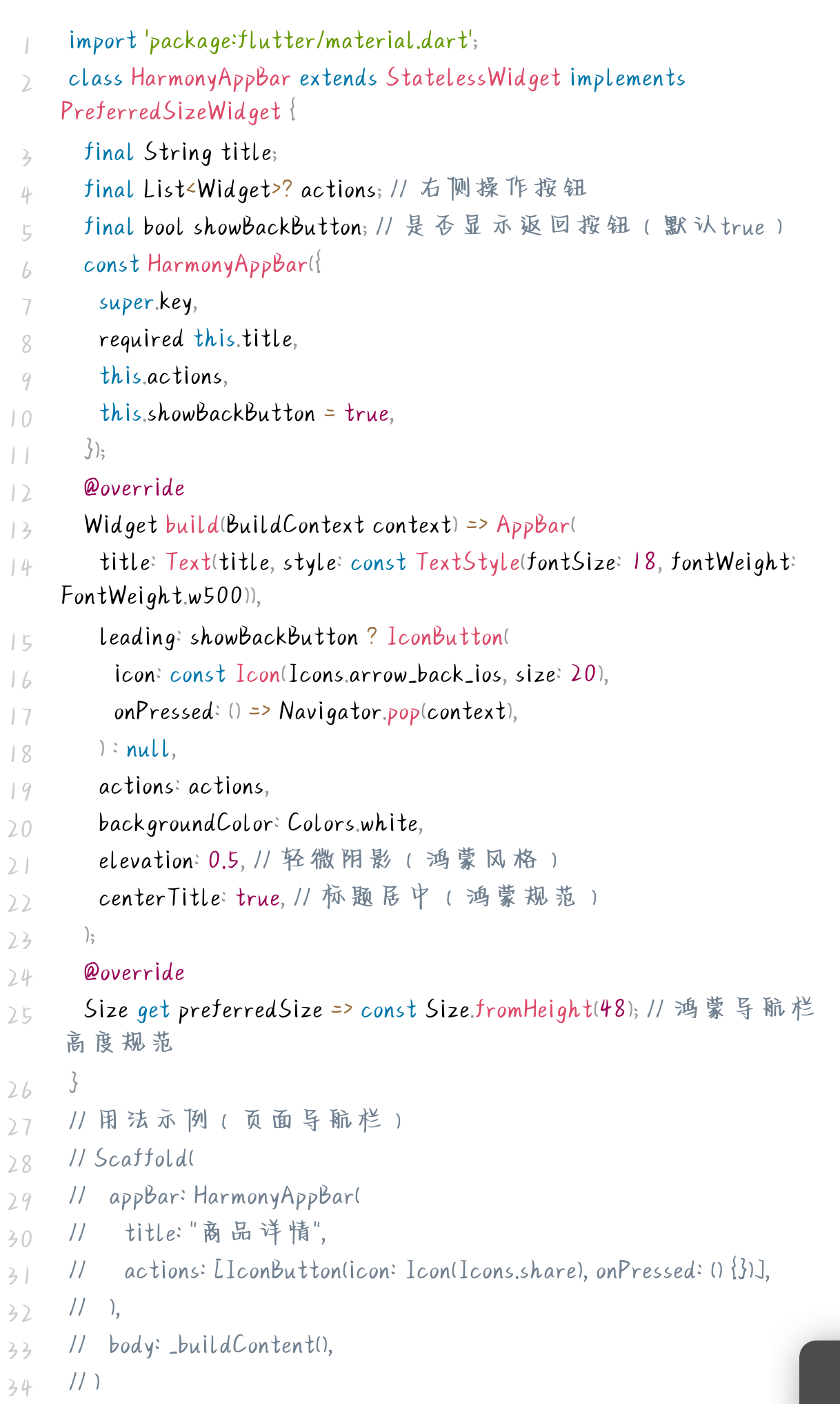 - 样式规范:白色背景、轻微阴影( elevation=0.5 )、标题居中、返回按钮为iOS风格箭头(适配鸿蒙跨设备交互);