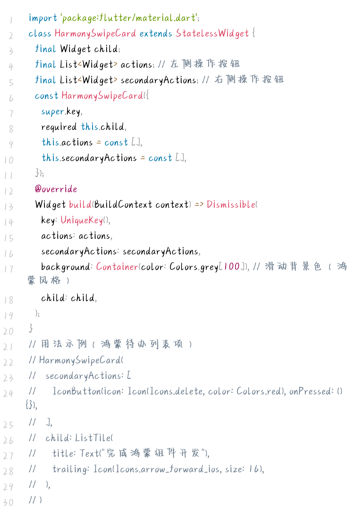 在开源鸿蒙生态的列表场景中(如消息列表、待办列表、文件列表),滑动触发操作(删除、编辑、标记已读)是高频交互。传统实现需依赖第三方滑动库(如 flutter_slidable ),存在包体积增大、与鸿蒙风格冲突等问题。因此,HarmonySwipeCard的核心目标是:基于Flutter原生API实现滑动操作、贴合鸿蒙交互规范、支持自定义操作按钮,轻量无依赖。