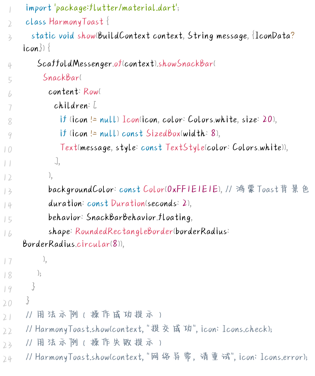 - 图标支持:可传入图标(如成功用 Icons.check 、失败用 Icons.error ),提升提示辨识度;
