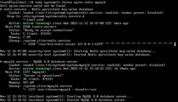 systemctl status命令输出确认,redis与mysqld服务均已进入active (running)状态,服务启动过程无报错。