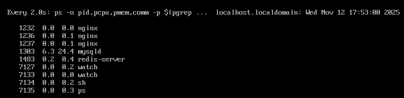 watch -n 2 'ps -o pid,pcpu,pmem,comm -p $(pgrep -f "redis|sysbench|mysql|nginx|docker") | grep -v PID'