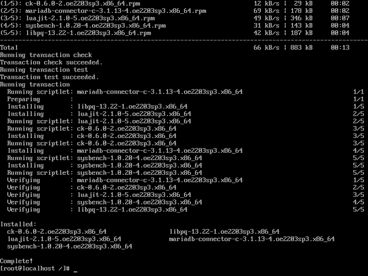 终端输出显示,所有软件包(redis、mysql-server、sysbench)均从openEuler官方仓库顺利下载并完成安装,依赖关系解析完整无误。