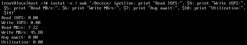 iostat -x | awk '/Device/ {getline; print "Read IOPS:", 4; print "Write IOPS:", 5; print "Read MB/s:", 6; print "Write MB/s:", 7; print "Avg await:", 10; print "Utilization:", 14}'