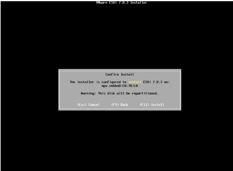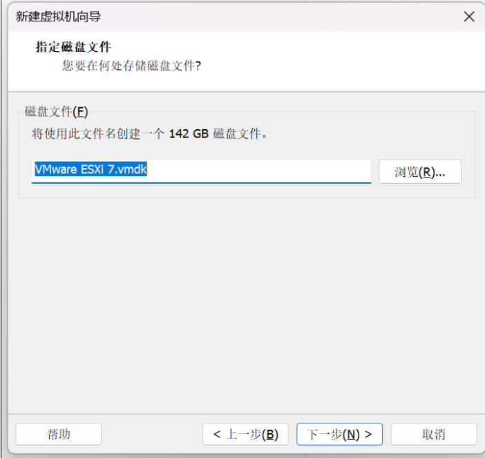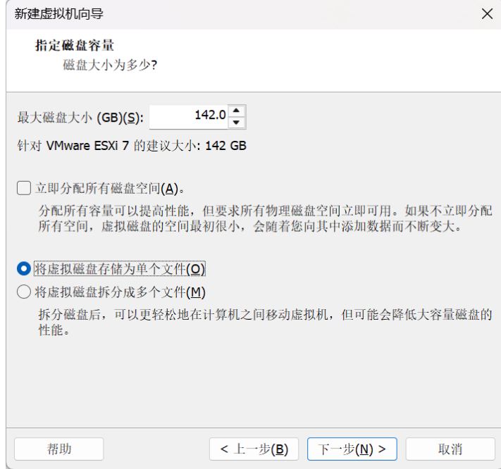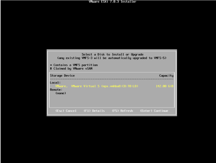 选择要安装 ESXi 的虚拟磁盘(应显示 142GB 容量)