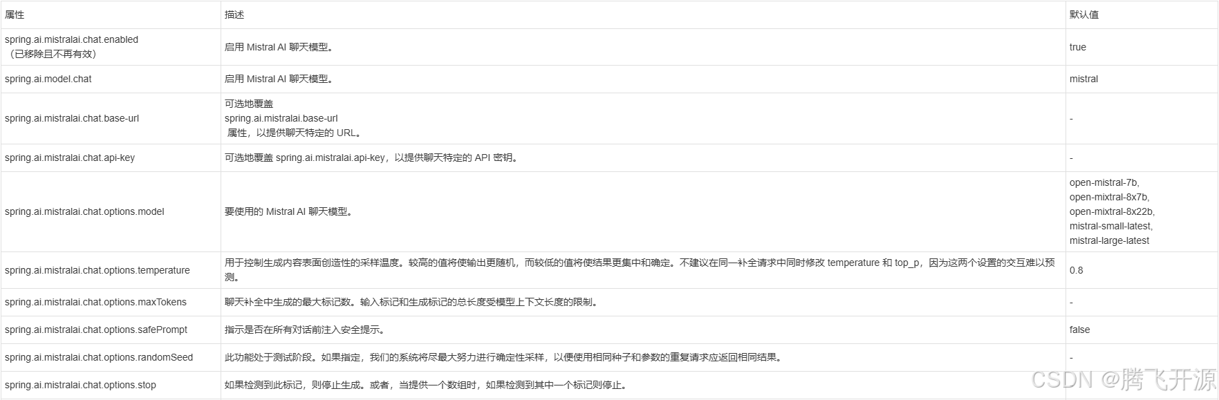 前缀 spring.ai.mistralai.chat 是用于配置 Mistral AI 聊天模型实现的属性前缀。
