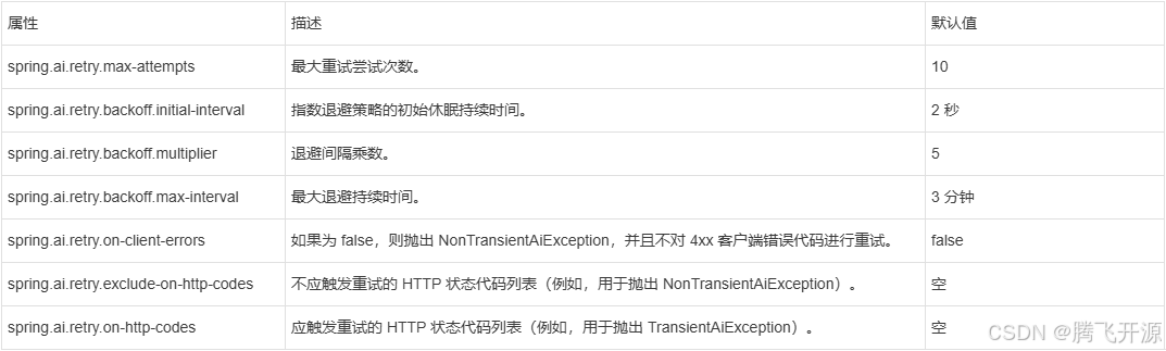 前缀 spring.ai.retry 用作属性前缀,允许您为 Mistral AI 聊天模型配置重试机制。