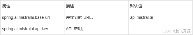 前缀 spring.ai.mistralai 用作属性前缀,允许您连接到 Mistral AI。