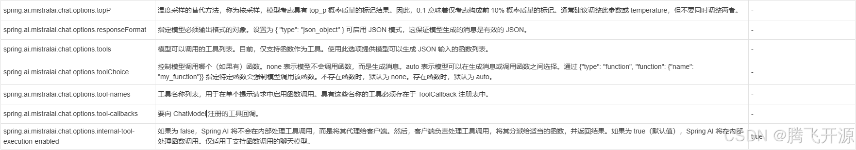 MistralAiChatOptions 为聊天请求提供配置信息。MistralAiChatOptions.Builder 是一个流畅的选项构建器。