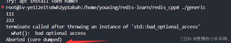 optional内部元素时,若optional处于 "无效状态(无值)",会触发std::bad_optional_access异常(类似图中 "SIGABRT" 这类程序崩溃)。