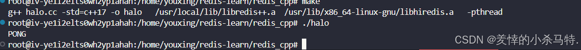 g++ halo.cc -std=c++17 -o halo /usr/local/lib/libredis++.a /usr/lib/x86_64-linux-gnu/libhiredis.a -pthread