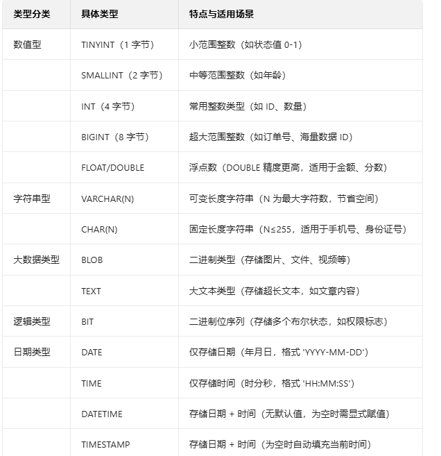 MySQL 支持多种数据类型,适配不同场景的数据存储需求:
