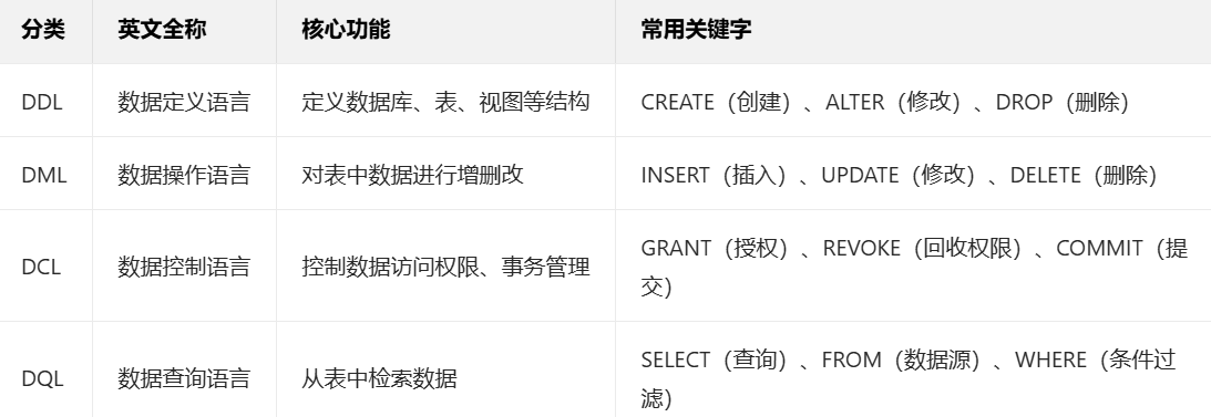 SQL 按功能可分为四大类,涵盖数据库操作的全流程: