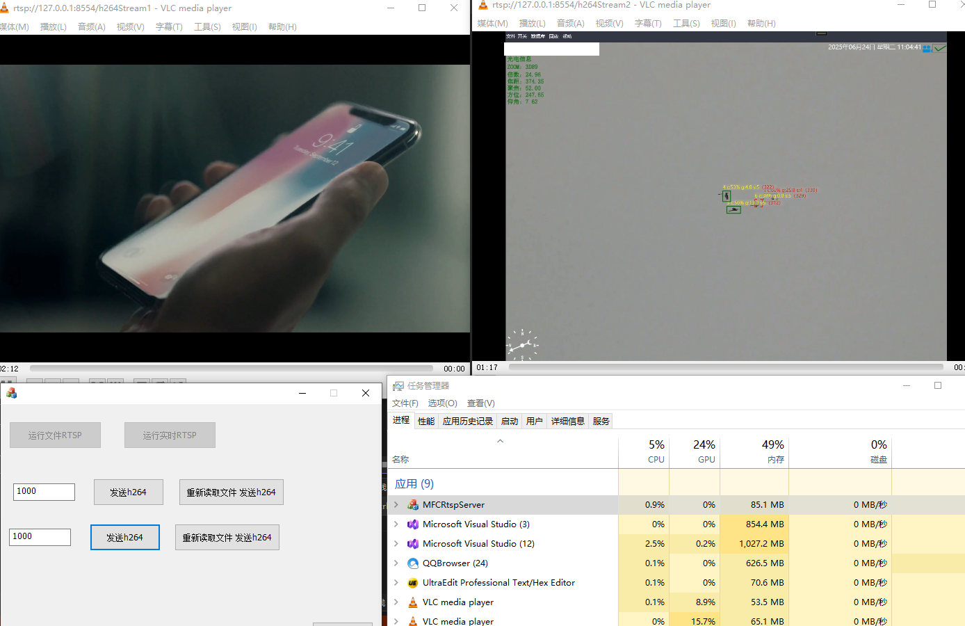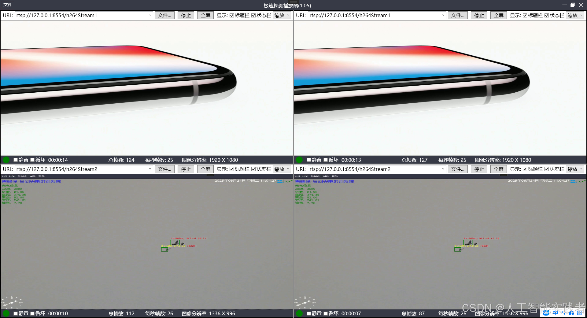 实测两路高清流并发播放,CPU 占用≤1%,内存占用极小,充分彰显了 Live555 底层架构的优异性能,为高并发、资源受限场景(如嵌入式设备)提供了可靠支撑。